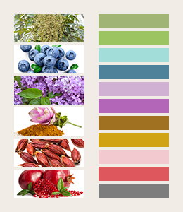 可染色的植物:丁香、薑黃、石榴、藍莓、梔子、鹽膚木。